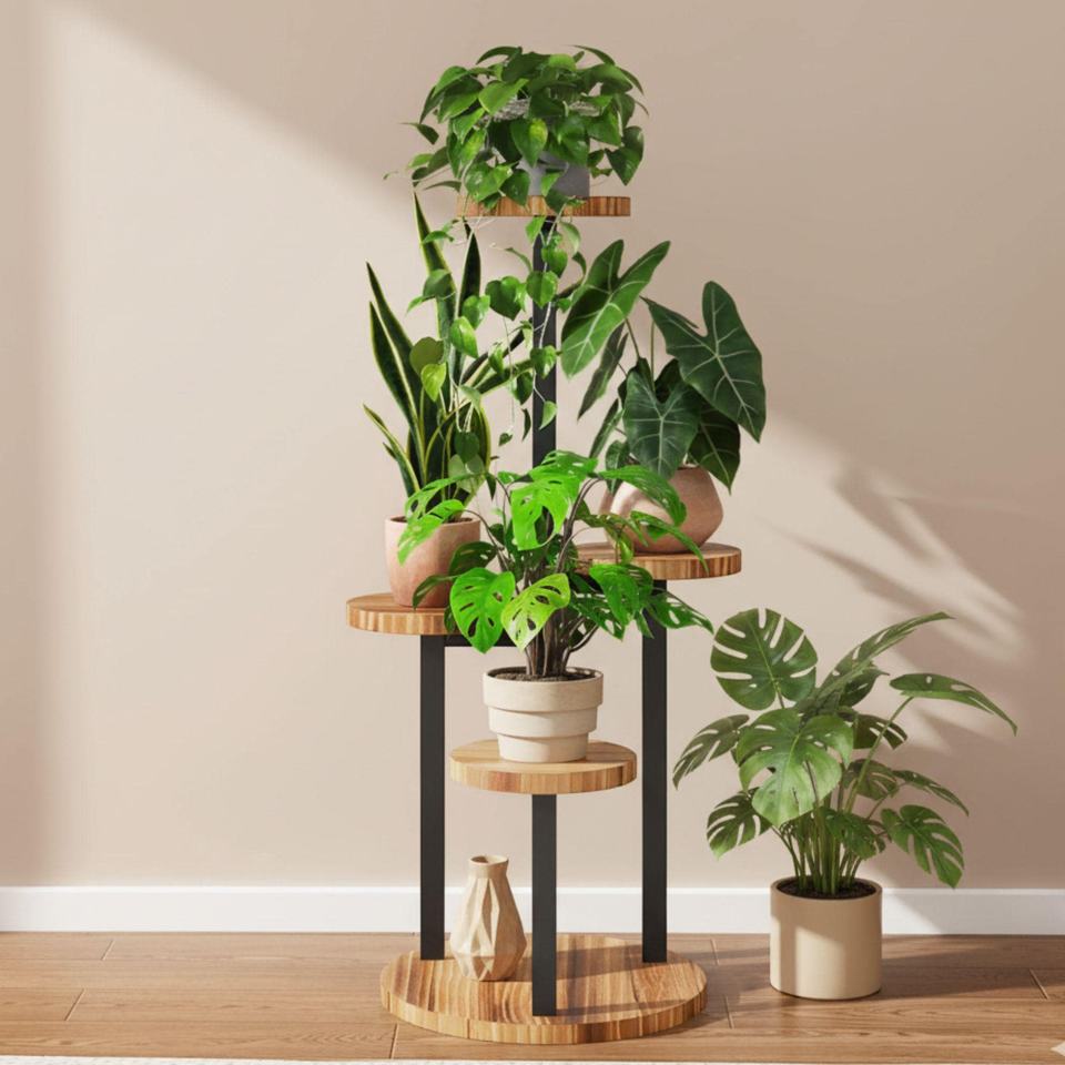 Stylish 4 Tier Wooden Metal Plant Stand With Round Shelves Contemporary Indoor Planter Display Rack For Home Balcony Living Room