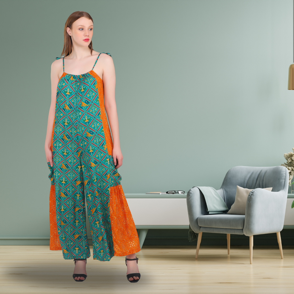 Stylish Boho Jumpsuit for Women Spaghetti Strap with Ruffled Sides Wide Leg Pants Casual Weekends Wear Party Natural Waistline