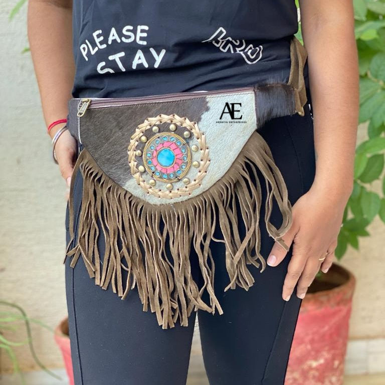 Stylish Brown Cowhide Fur Leather Belts with Fringe Hip Pocket and Waist Waist Zipper Closure Travel Style