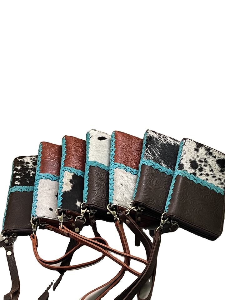 Stylish Cowhide Fur Wallet Multi Uses New Design Western Leather Wallets Zipper Closure Hand Tooled Carving Clutch Phone Case