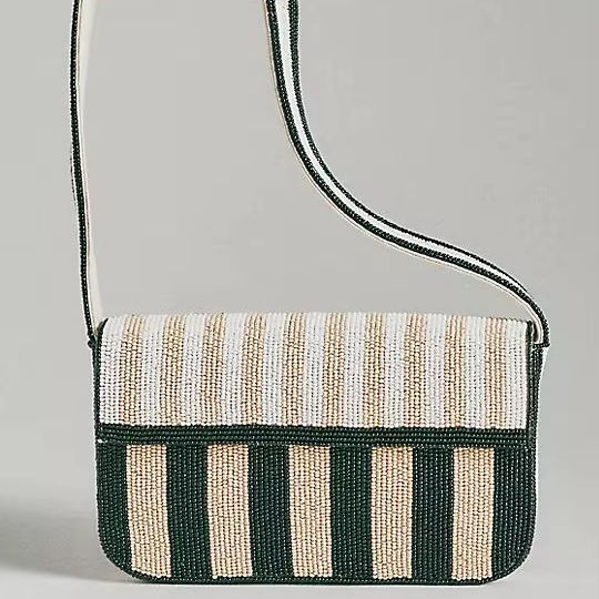 Stylish Dark Green And Cream Striped Beaded Shoulder Bag For Women Small Rectangular Seed Bead Evening Purse Patterned Handbag