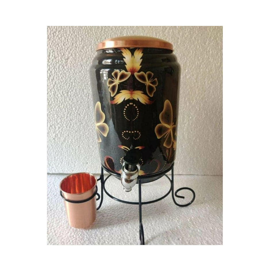 Stylish Design Printed Copper Water Dispenser with Glass Water Storage Pot Stand Hammered Handmade Copper Water Dispenser