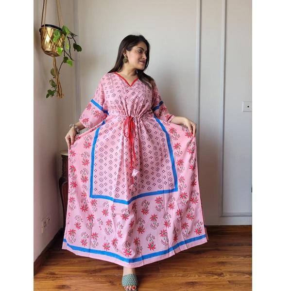 Stylish Hand-Block Printed Cotton Kaftan Loose Flowing Ethnic Dress With Vibrant Prints Ideal For Home Parties And Vacation