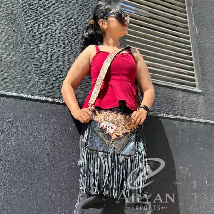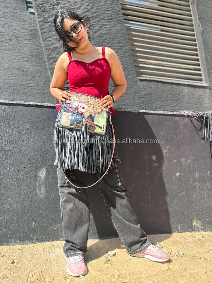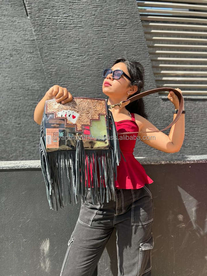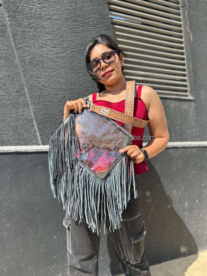 Stylish Hand Tooled Cowhide Leather PVC Clear Fringe Crossbody Bags Hot Selling Real Leather Stadium Bags for Women's Multi Use