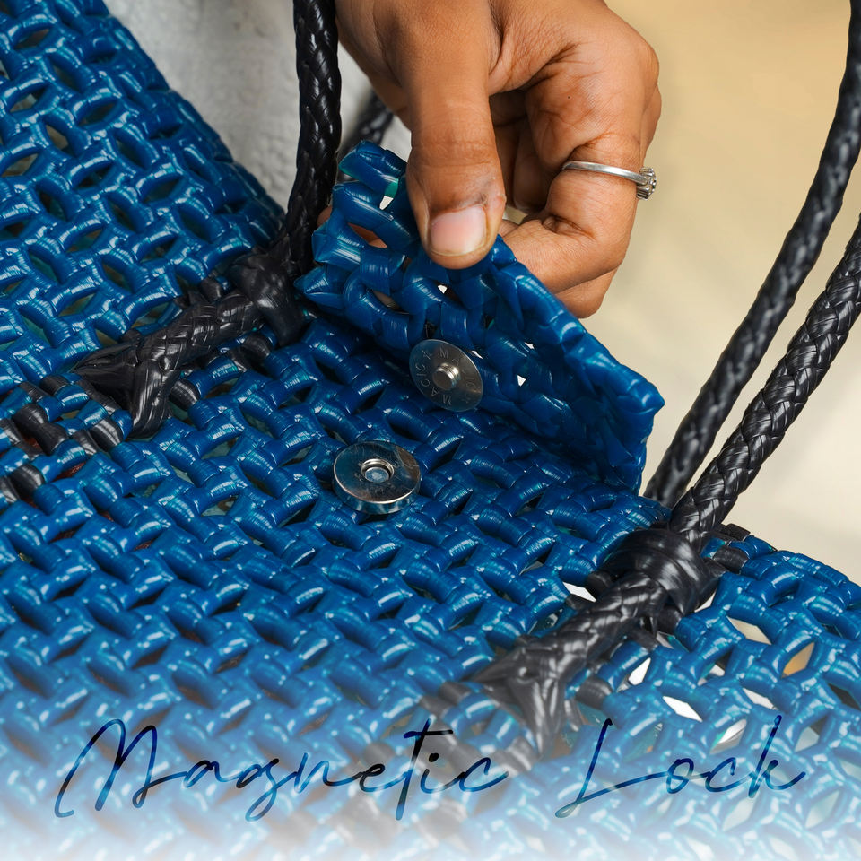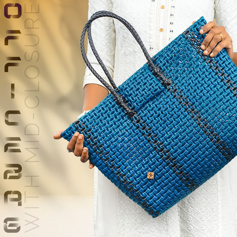 Stylish Handwoven Office Tote Bag in Elegant Blue with Secure Mid Closure Spacious Design Perfect for Work and Travel