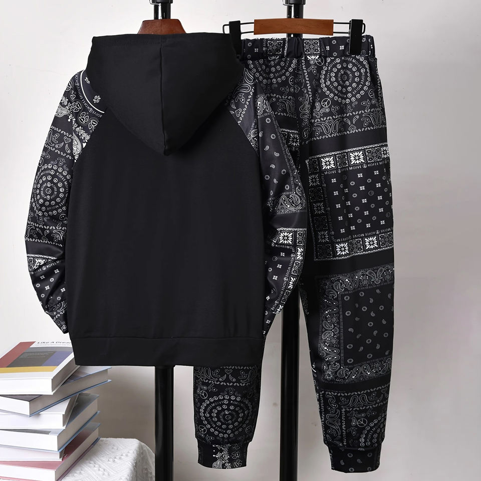 Stylish High Quality Boys' Black Print Long-Sleeve Hoodie & Jogger Pants Set Breathable for Outdoor Casual Wear