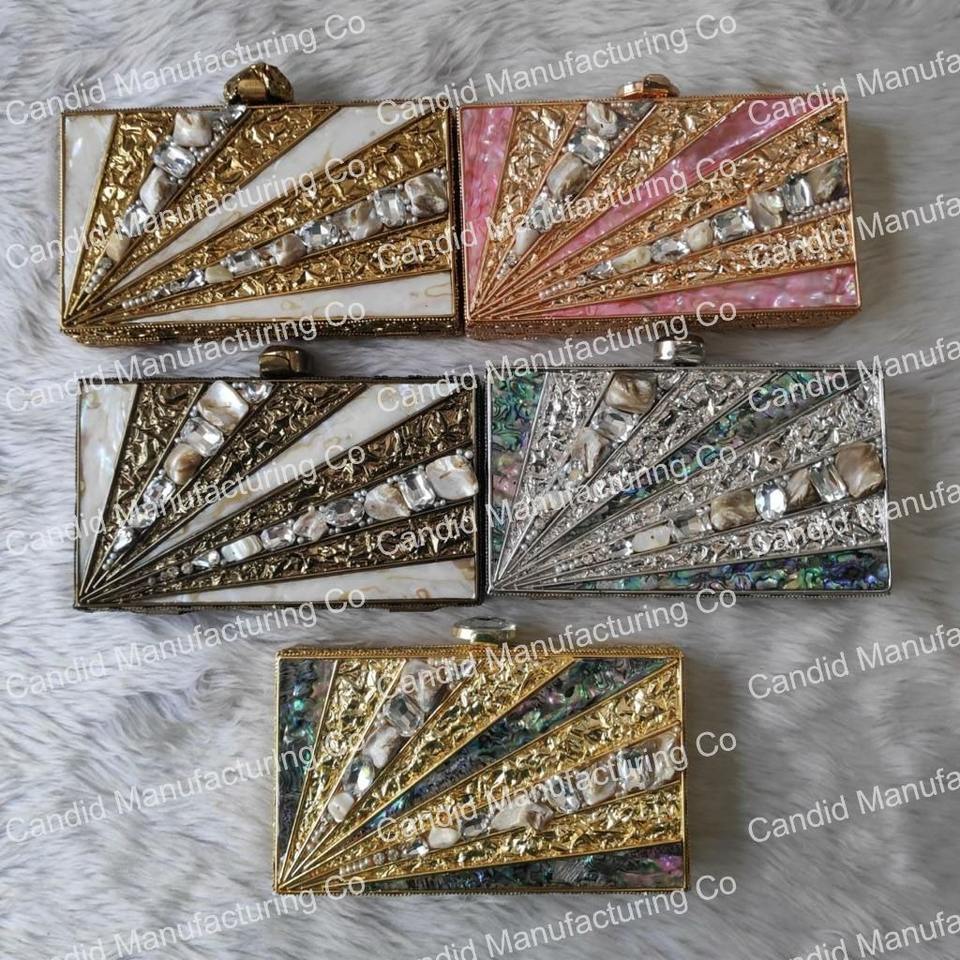 Stylish Ladies Party Ware Hanging Bag Fashionable Mother Pearl Clutch Shoulder Bag Stone Work Embellishment Embroidery Chains