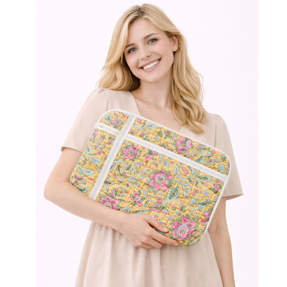 Stylish Laptop Sleeve Cotton Quilted Zip Closure Multi-Pocket Design Jaipur Hand Block Print Soft Skin Friendly Customizable