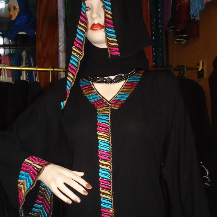 Stylish Machine Embroidery on Black Abaya With Head Scarf