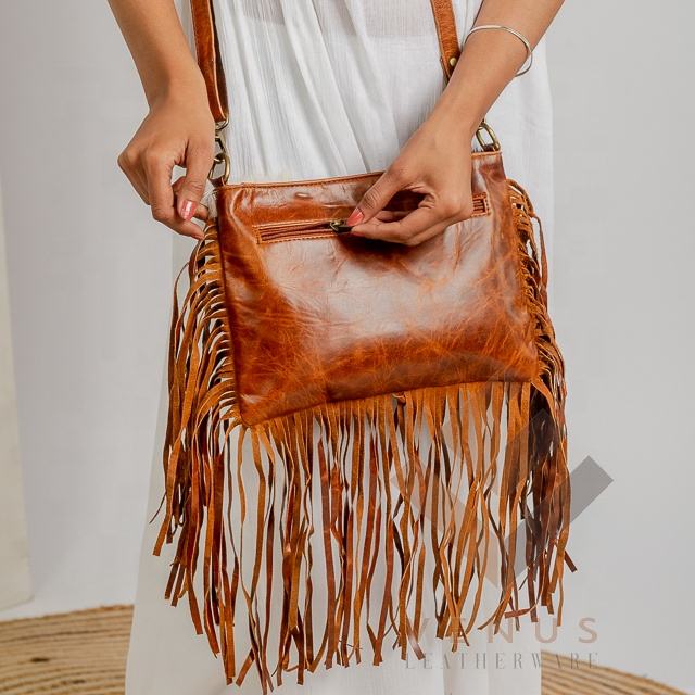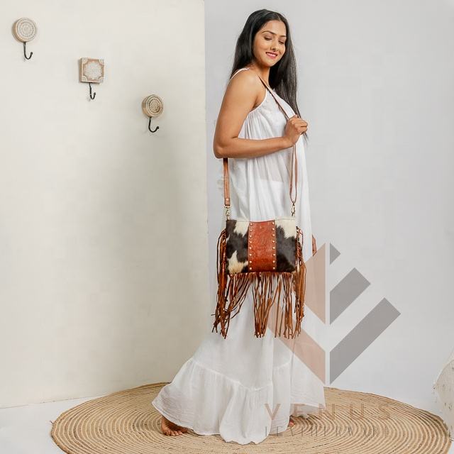 Stylish Preppy-Style Bohemian Vintage Cowhide Fur Sling Bag Geometric Leather Handbag Stone Tooled Hair Fringe for Summer Winter