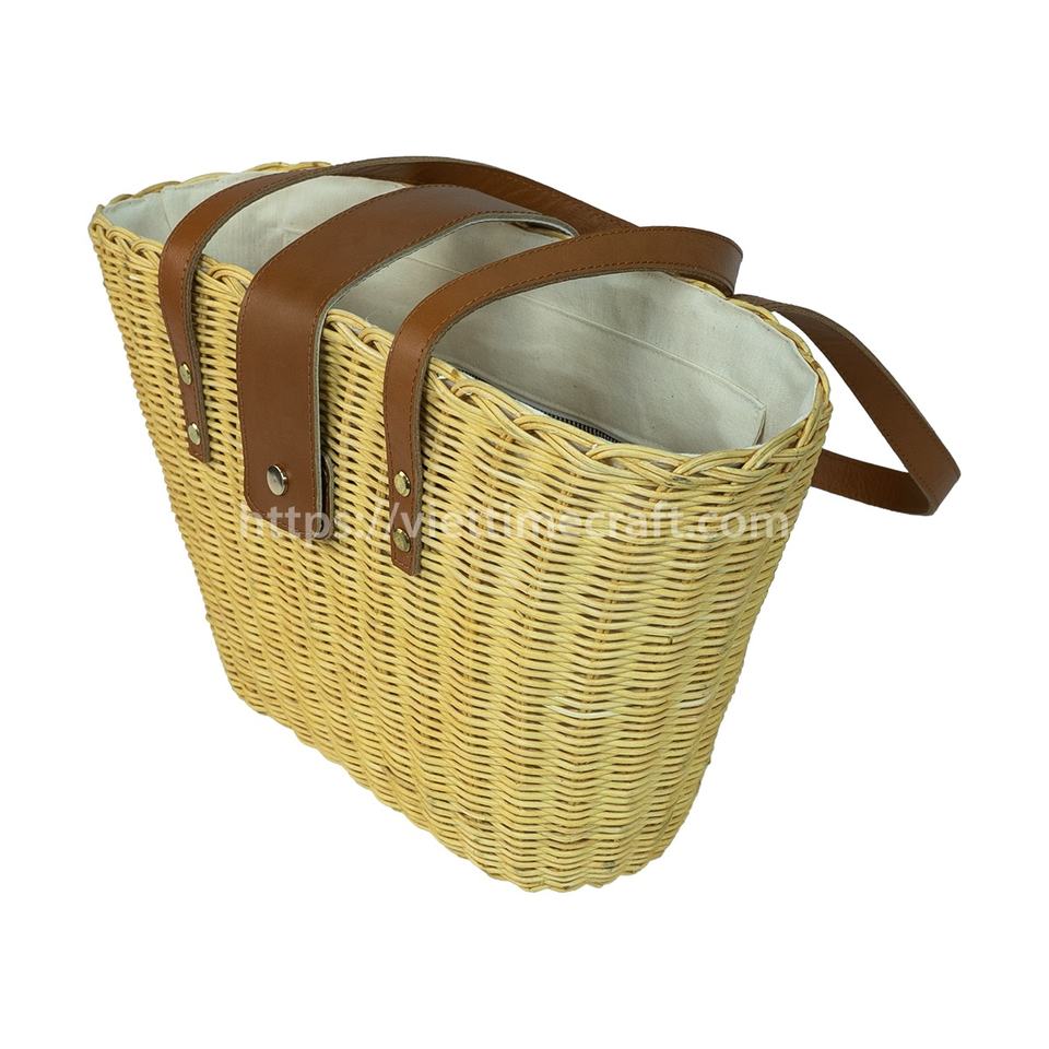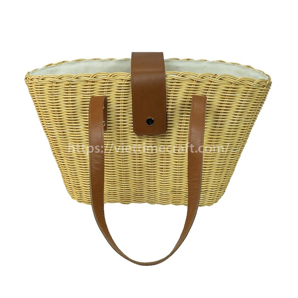 Stylish Rattan Tote Bag with Faux Leather Strap, Woven Rattan Fashion Bag with Snap Closure Handmade in Vietnam
