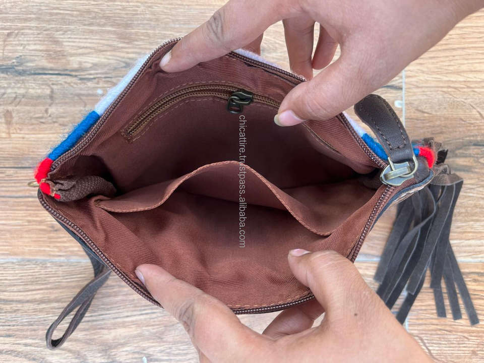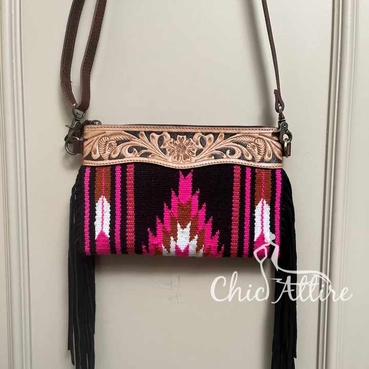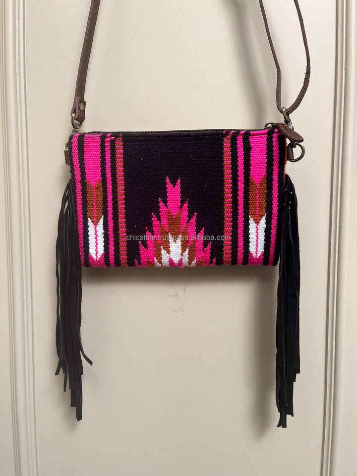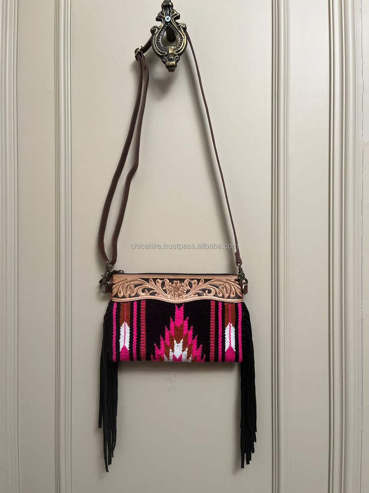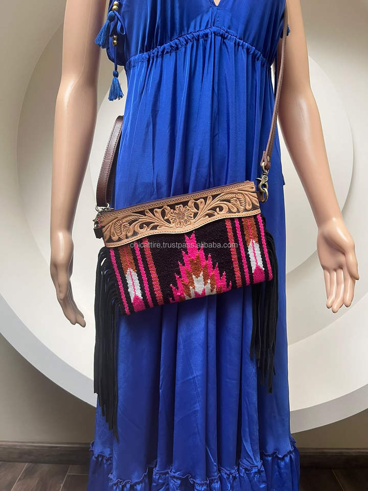 Stylish Saddled Blanket Tooled Leather Sling Bags High Quality Aztec Leather Crossbody Bags New Vintage Multi Color Fringe Bags