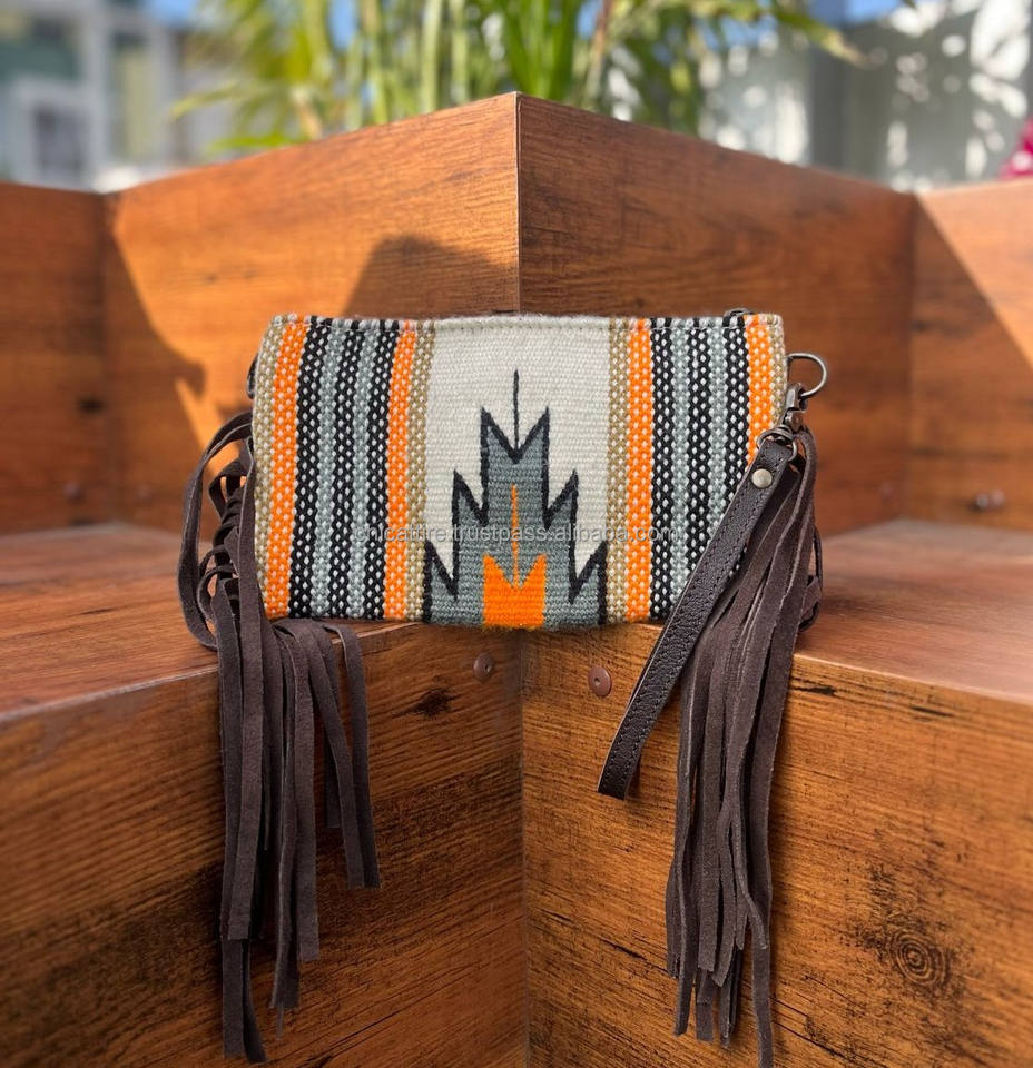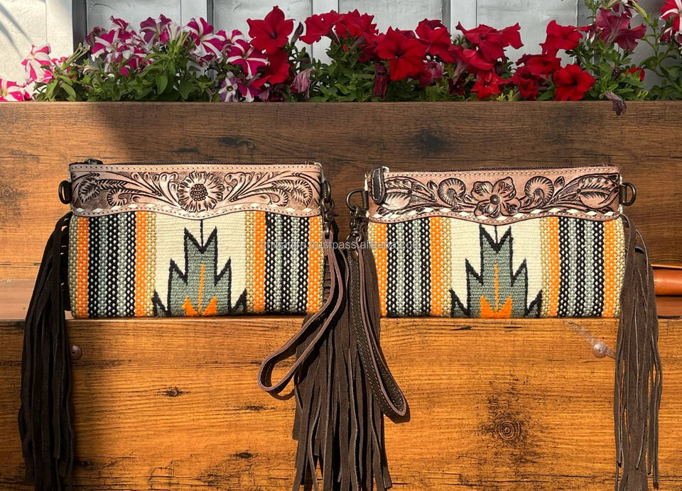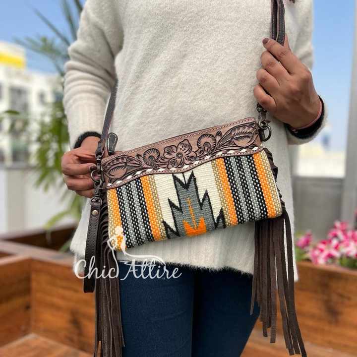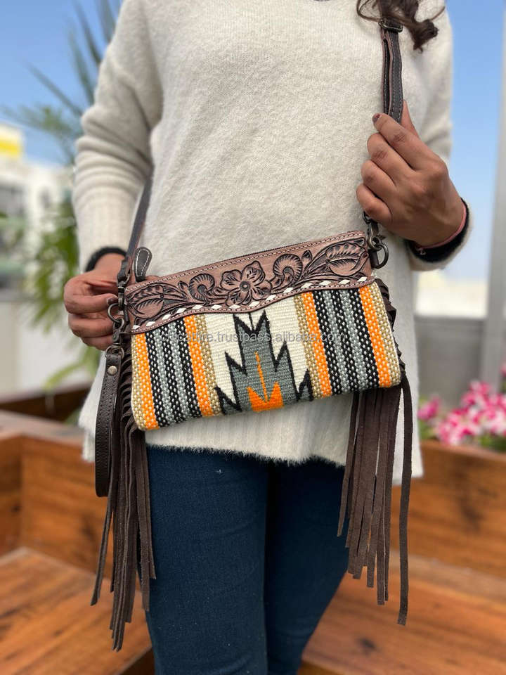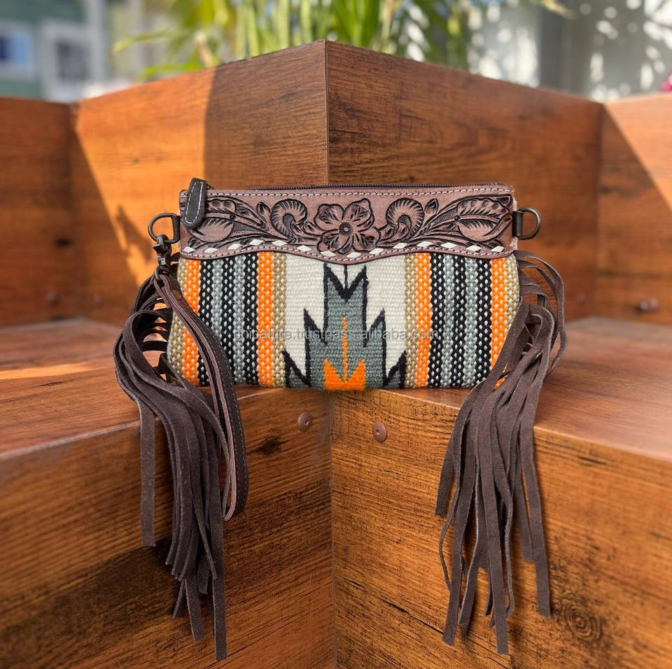 Stylish Saddled Blanket Tooled Leather Sling Bags High Quality Aztec Leather Crossbody Bags New Vintage Multi Color Fringe Bags