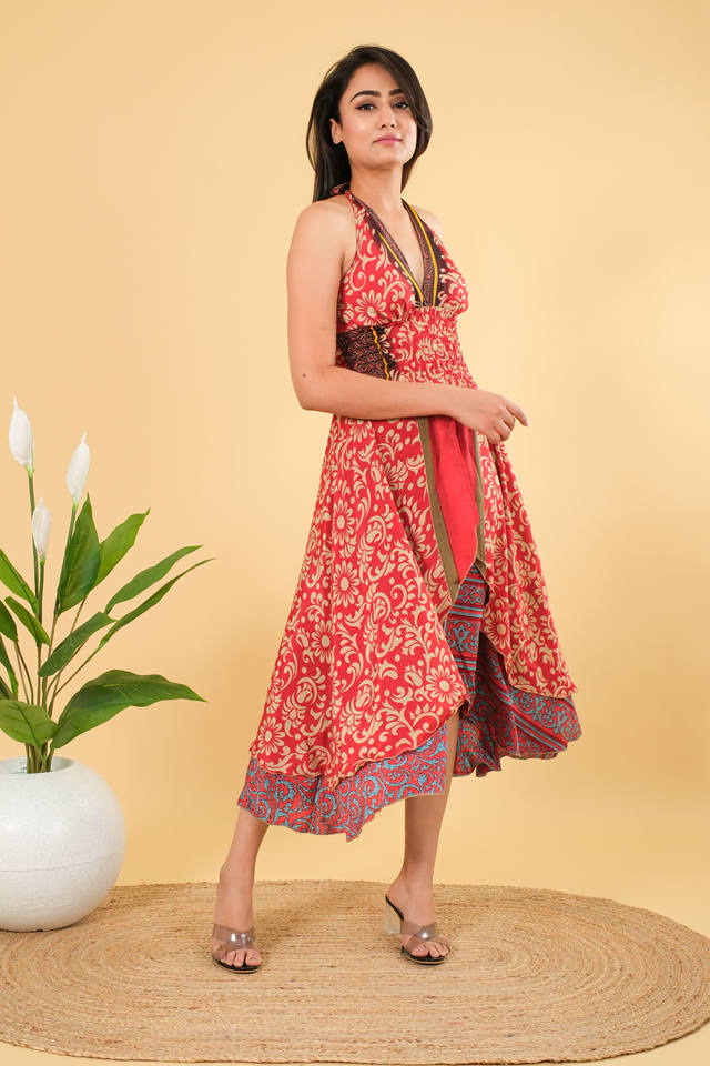 Stylish Silk Maxi Dress for Women Free Flow Halter Backless Boho Print Indian Party Wear Natural Waist Floor-Length Long Dress