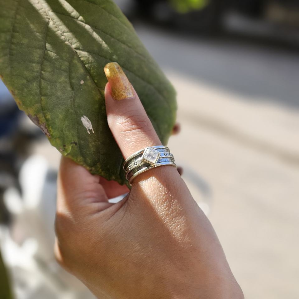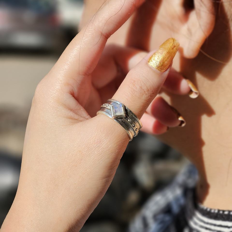Stylish Silver Moonstone Rhombus Ring Oxidized Silver Wedding and Party Accessory