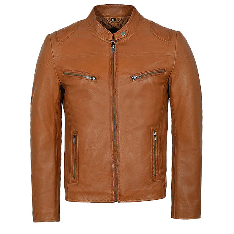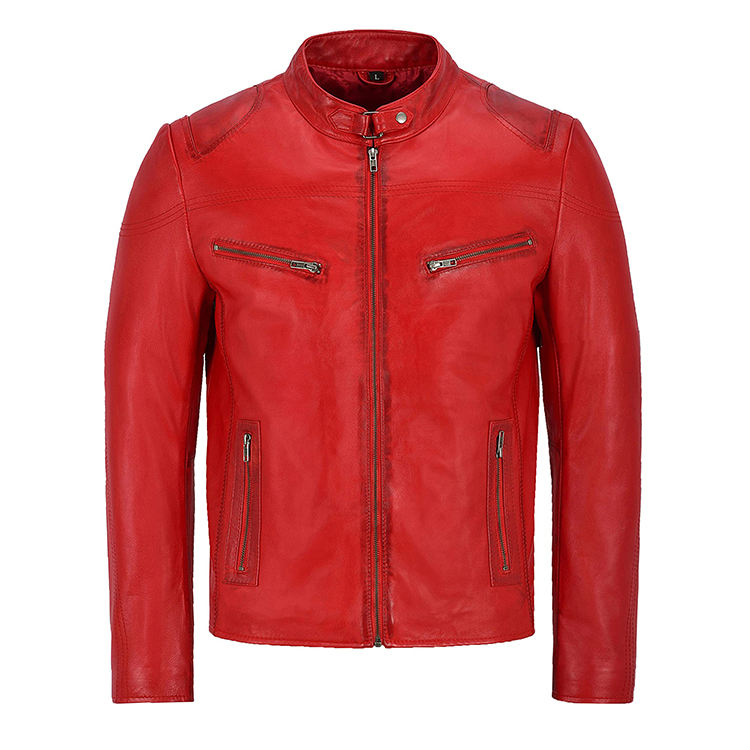 Stylish Slim Fit Breathable Sheep Skin Leather Jacket with Stand Collar and Front Logo Customization