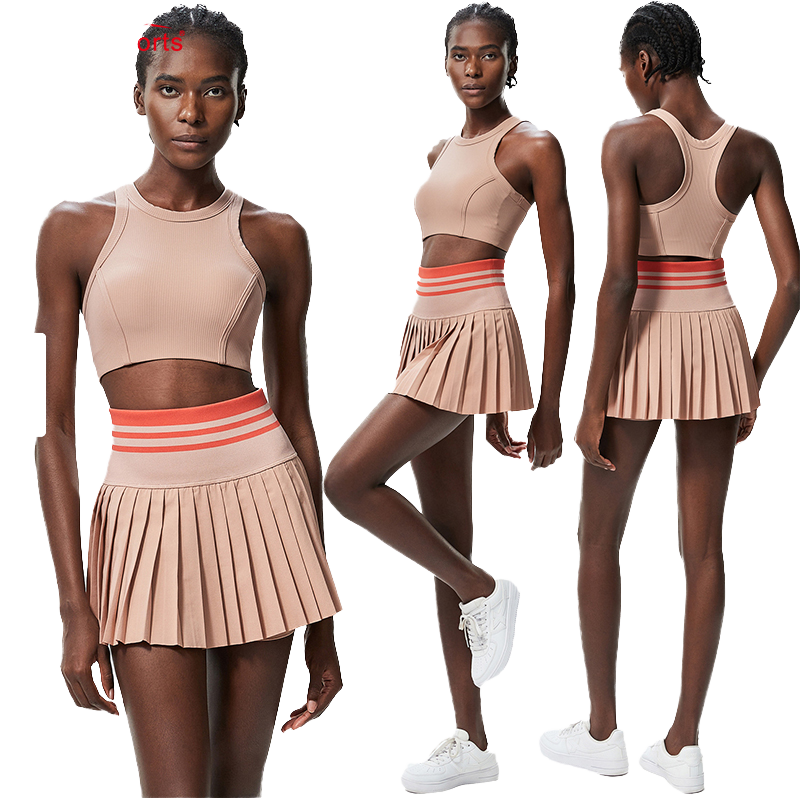 Stylish Solid Pleated Shorts with Matching Racerback Crop Top-Lightweight Four-Way Stretch Athletic Set for Women