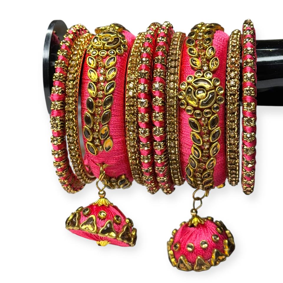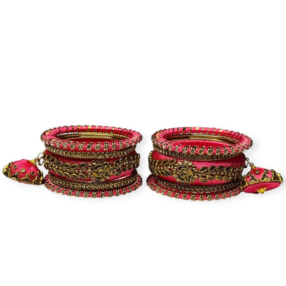 Stylish Sparkling Pink Gold Plated Premium Imitation Thread Pearl Bangle Set Trendy Wedding Festive Wear Stackable Bangles