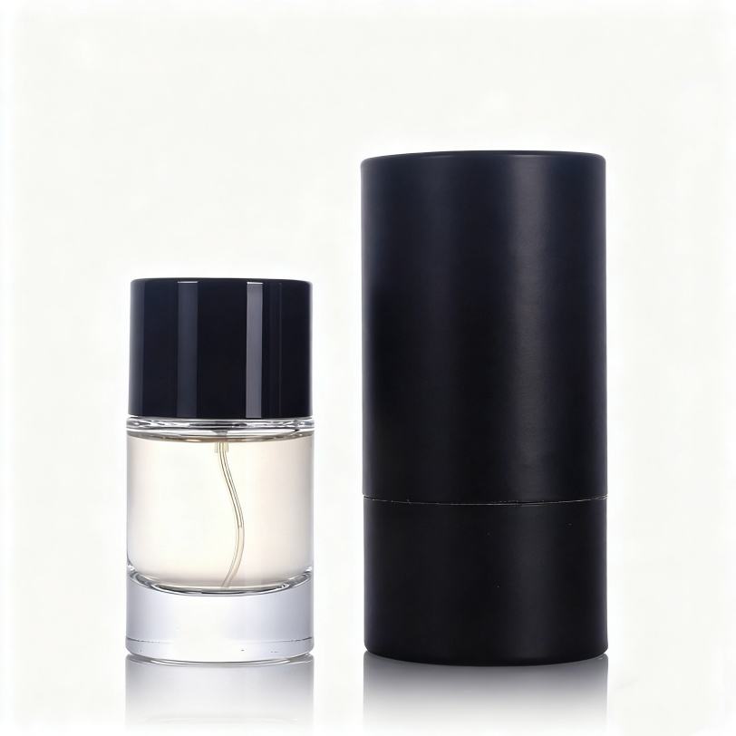 Stylish Transparent Cylindrical Glass Perfume Bottle 30ml 50ml Glossy Black Plastic Cap Refillable