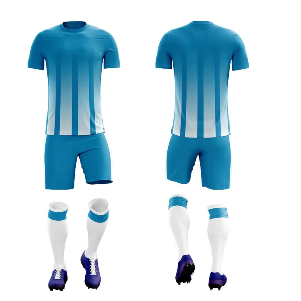 Stylish Two Tone Soccer Jersey Kit White & Blue Sublimation Print V Neck Football Uniform With Shorts Mens Training Sportswear
