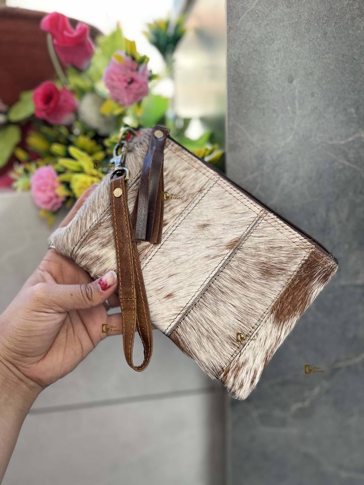 Stylish Vintage Brown Cowhide Leather Wristlet Clutch Pouch Real Leather Small Western Patches Wallet Zipper for Spring Winter