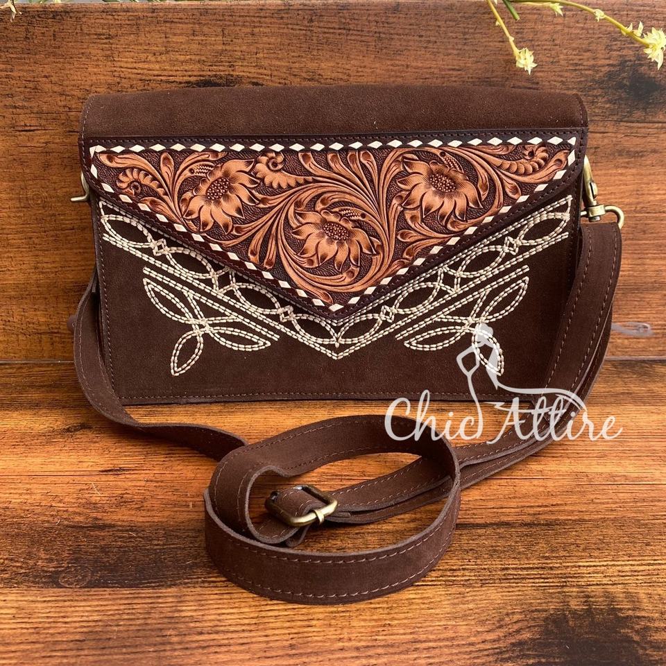 Product name:Hand Tooled Suede Leather Crossbody Bag