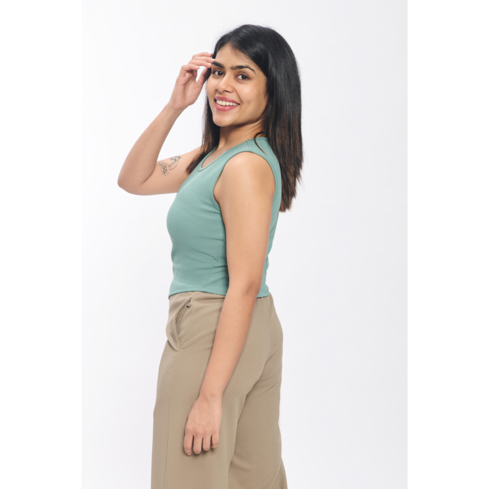 Stylish Women Turquoise Ribbed Crop Top Sleeveless Stretchable Spandex Camisole Lightweight Summer Outfit