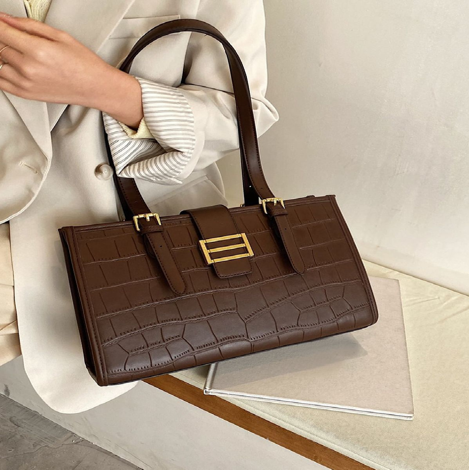 Stylish chocolate brown faux crocodile leather hand bag, shoulder bag with gold-tone buckle, available at wholesale price.