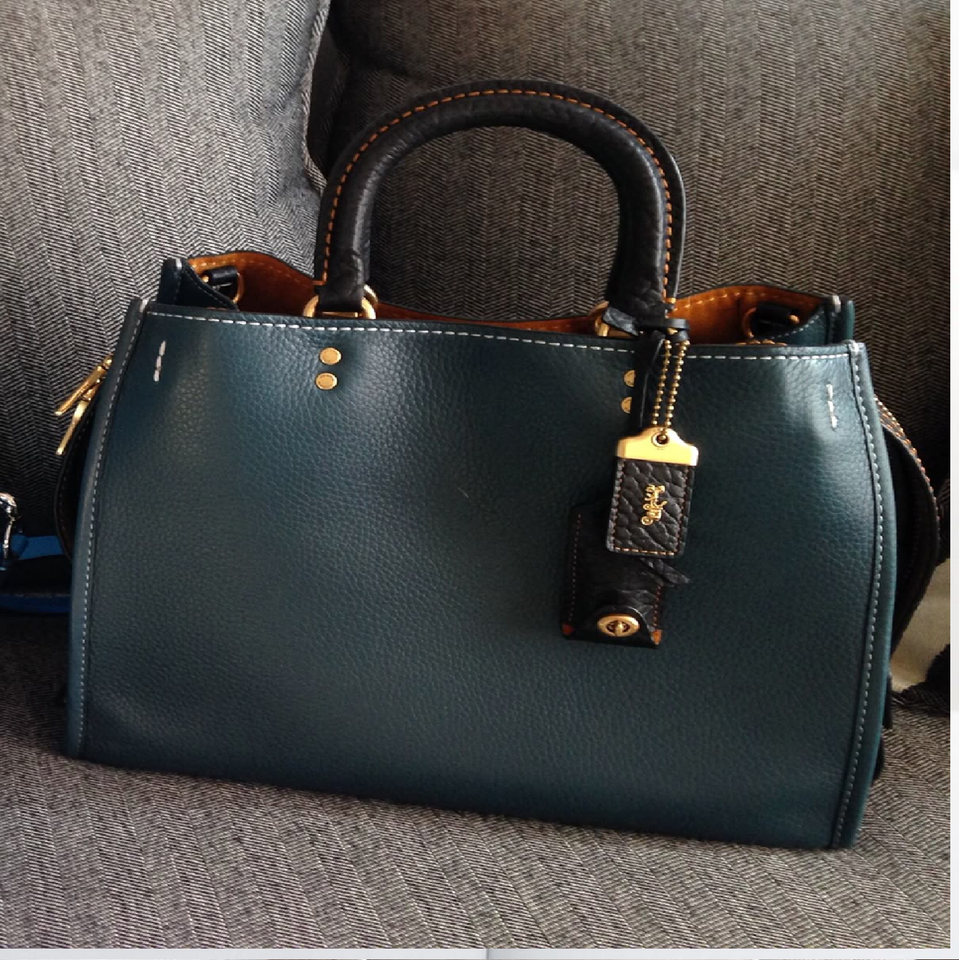 Stylish dark green faux leather handbag, shoulder bag with contrast stitching and a unique charm, available at wholesale price.