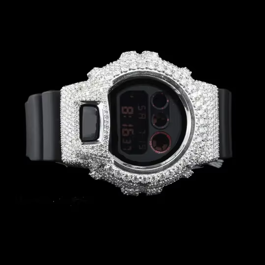 Stylish hip hop digital watch with iced out silver tone bezel and sparkling stones for bold modern mens fashion jewellery look