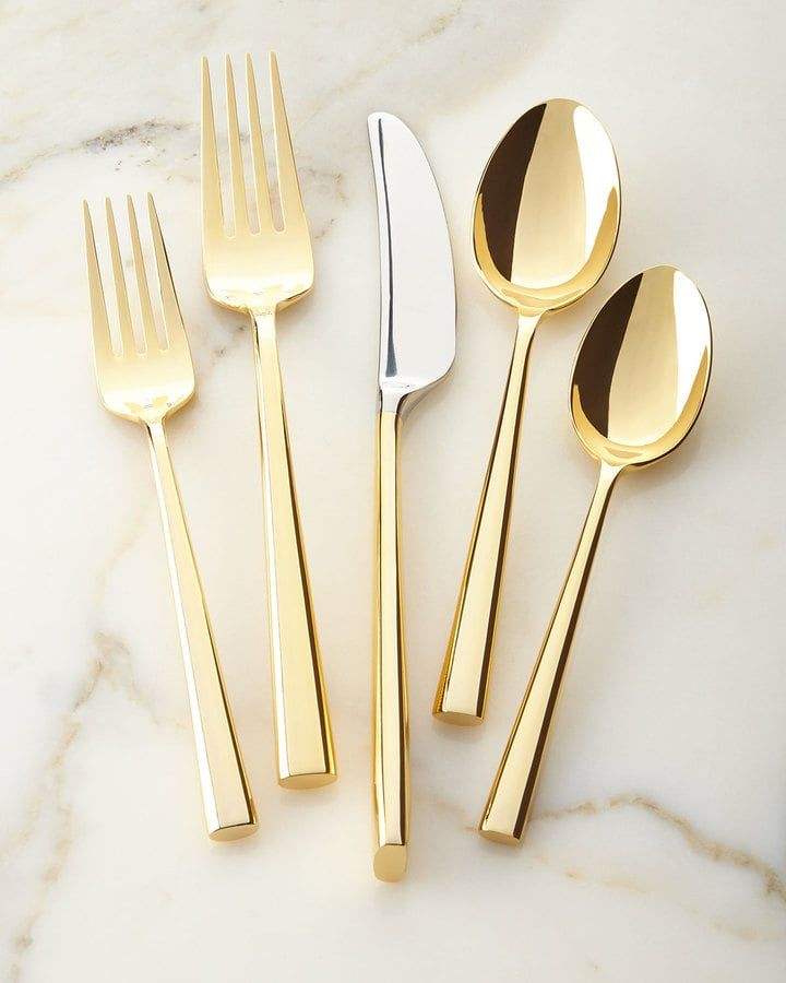 Stylish mirrored steel gold flatware set with steel core for impressive presentation festive table decor and formal meal service
