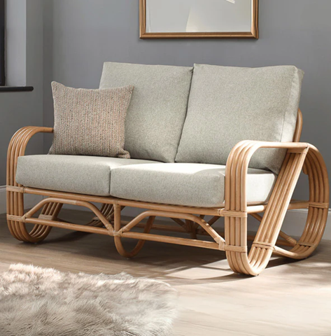 Stylish outdoor cane sofa set, featuring dark woven wicker and striking orange patterned cushions, available at wholesale price.
