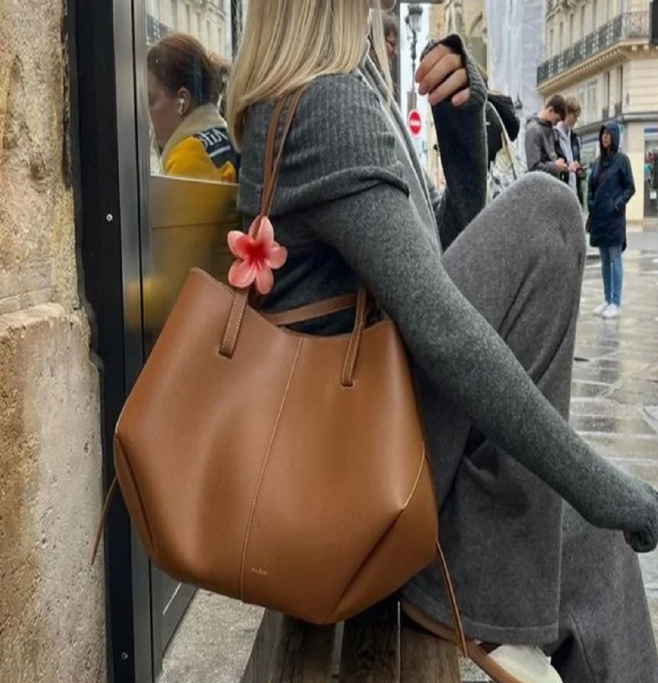Stylish, soft brown leather ladies purse with a unique flower accessory, available at wholesale prices now.