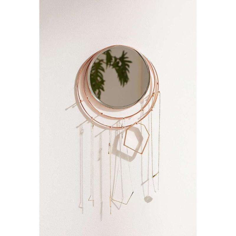Stylish wall-mounted metal brass jewelry hanger with mirror and vintage accents for adding charm to jewelry organization