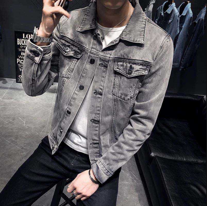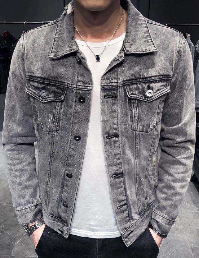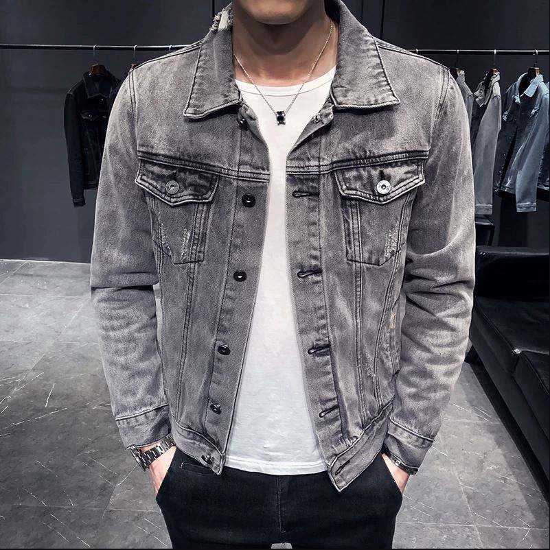 Stylish winter men denim jacket warm fleece lining oversized blue jean outerwear distressed vintage fashion coat casual