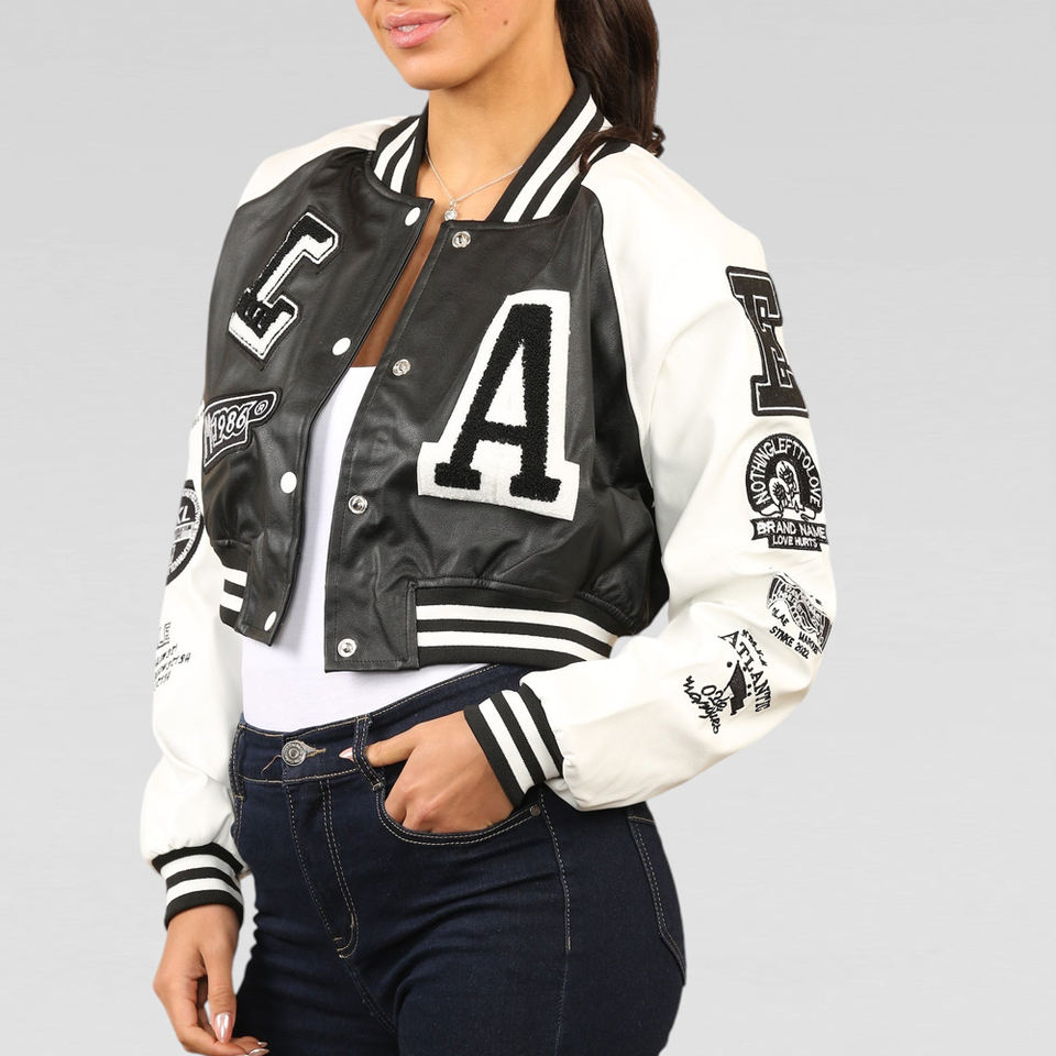 Stylish womens college baseball jacket with black white contrast soft PU leather sleeves and varsity letter patch design