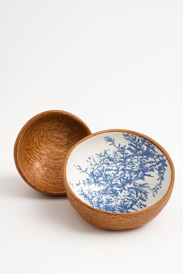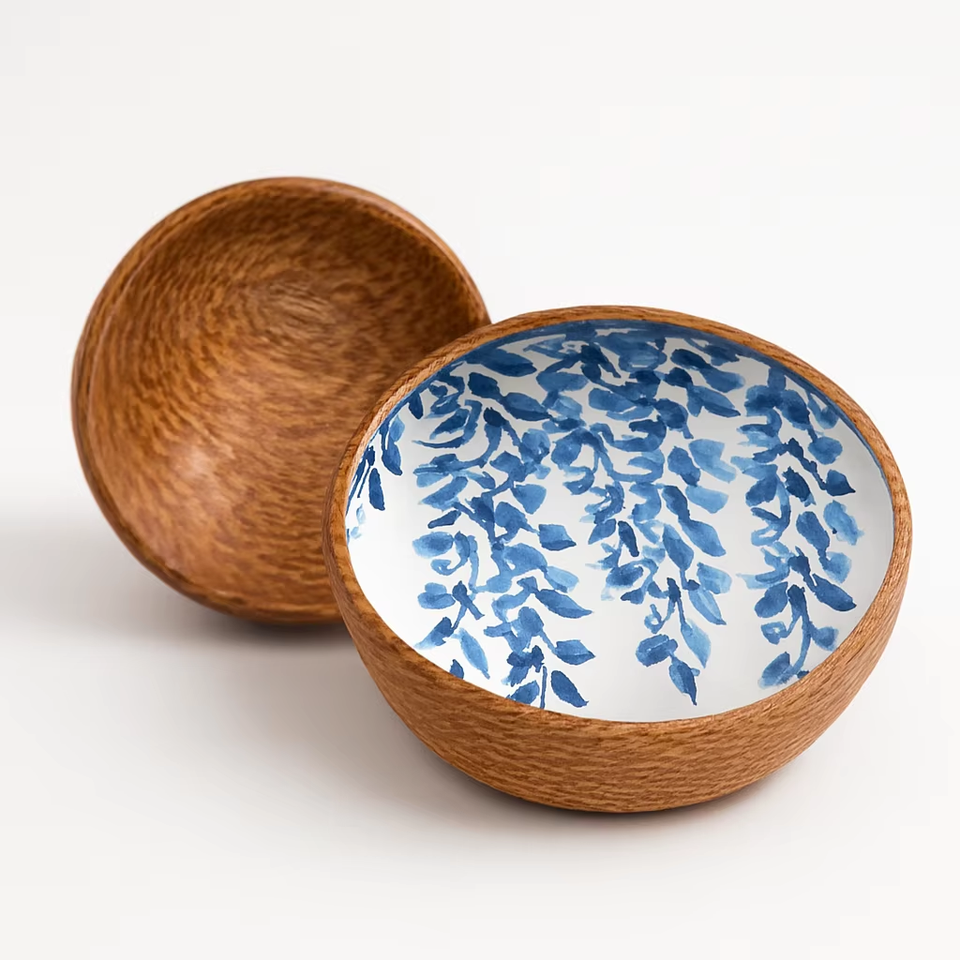 Stylish wooden bowl with cascading indigo foliage artwork on inner ceramic perfect for decorative or serving functional purposes
