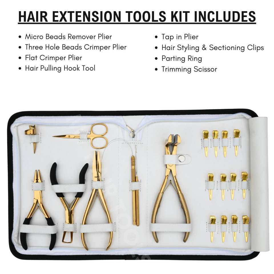 Stylist Gold Hair Extension Tool Kit with Microbead Three-Hole Crimper Flat Applicator Plier Tape-In Press & Scissors Stainless