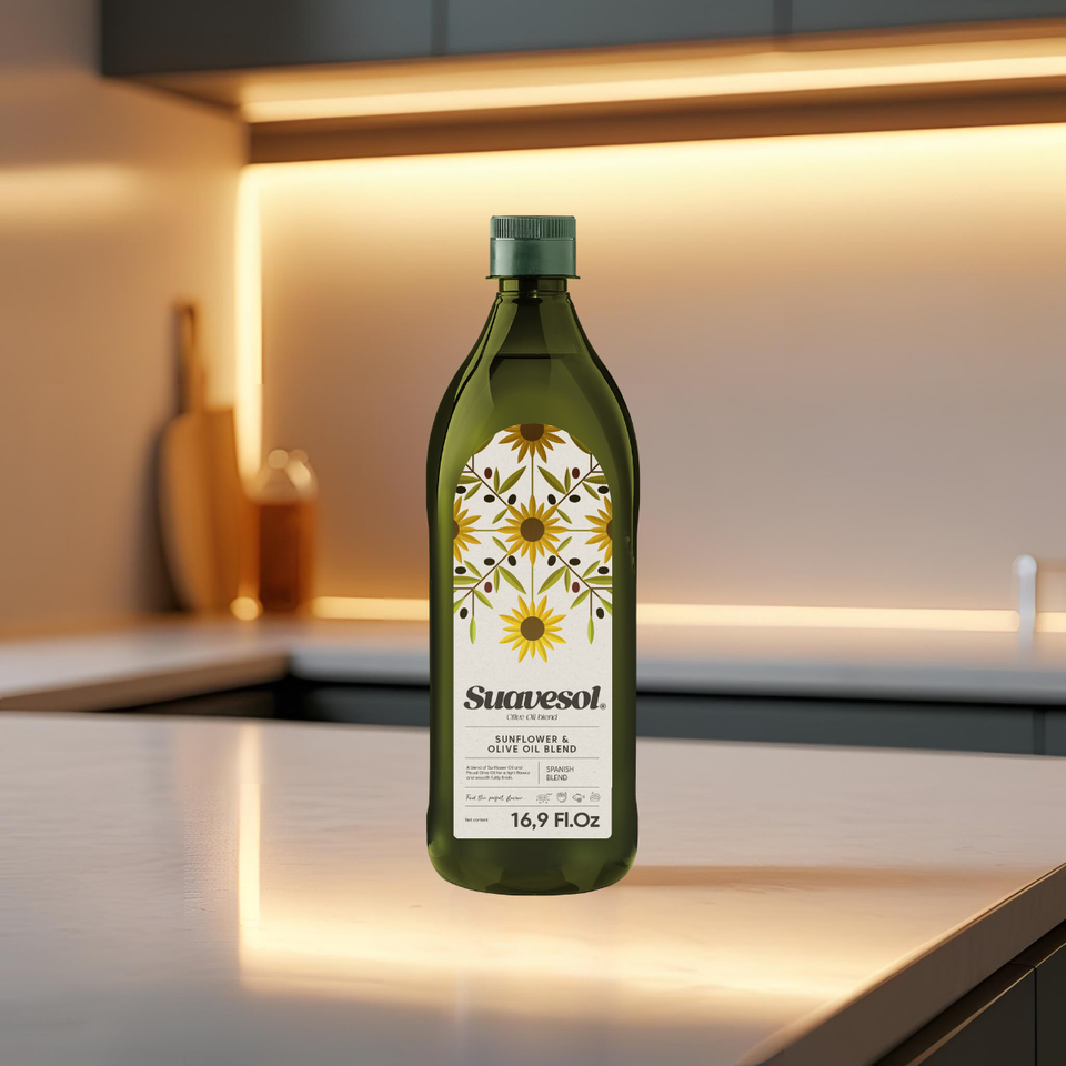 Suavesol 1L Blended Olive and Sunflower Oil PET Round for Cooking and Frying Plant-Based Ingredients