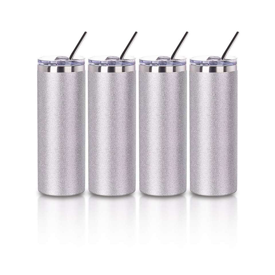 Sublimation Blank Glitter Skinny Tumbler Silver 20 OZ Straight Stainless Steel Coffee Cups with Lid and Metal Straw for Tumbler