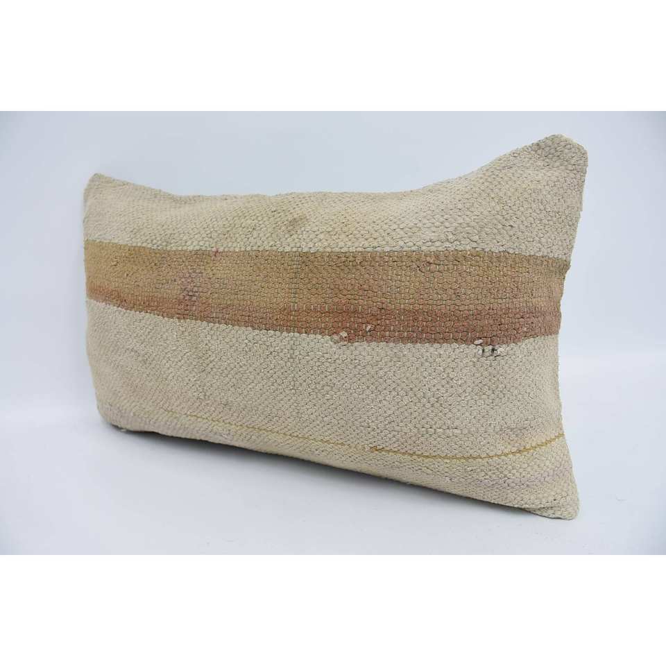 Subtle Striped Beige Wool 12x20 Inches Kantha Pillow Luxury Vintage Fluffy Woven Decorative Cushion for Sofa and Floor Use