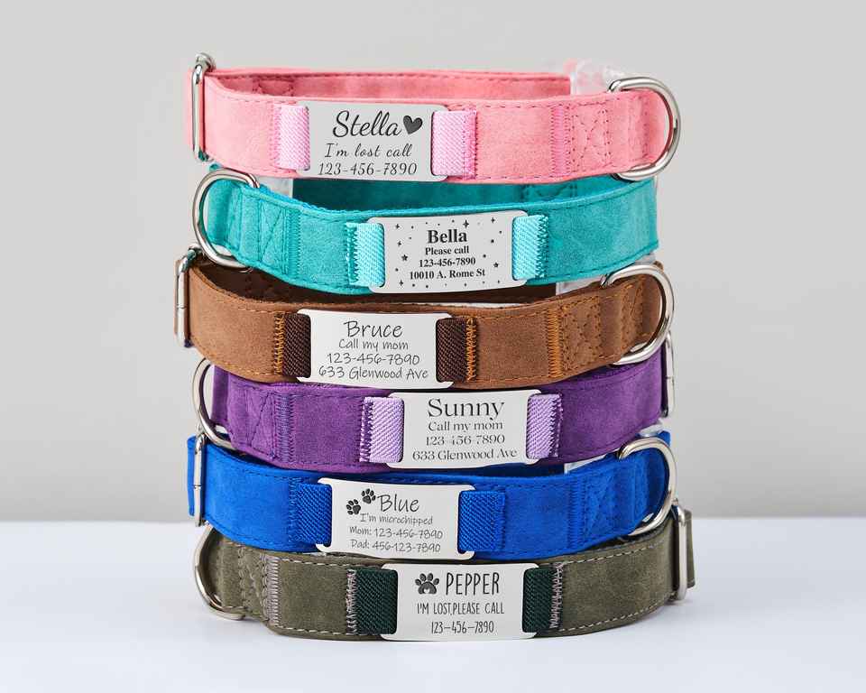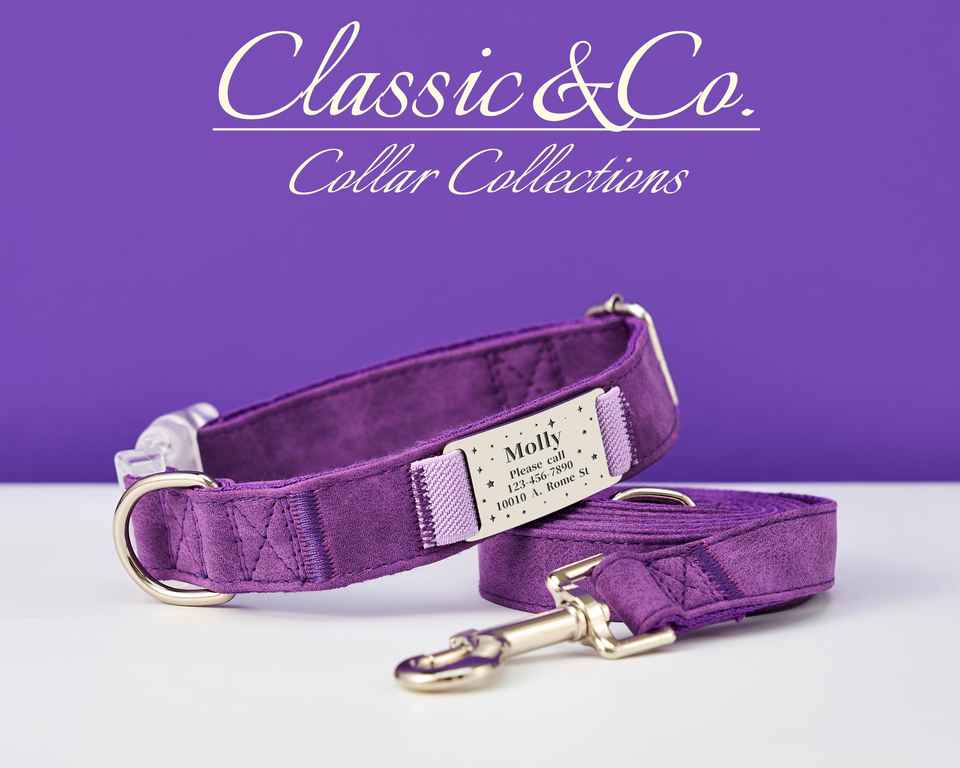 Suede Leaher Dog Personalized Leash Se, Adjusable Cusom Purple Ca Collar Wih Free Bell, Engraved Meal Tag, Unique Pe