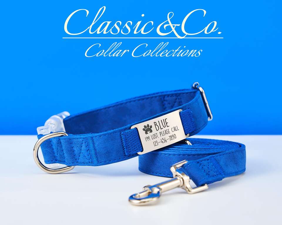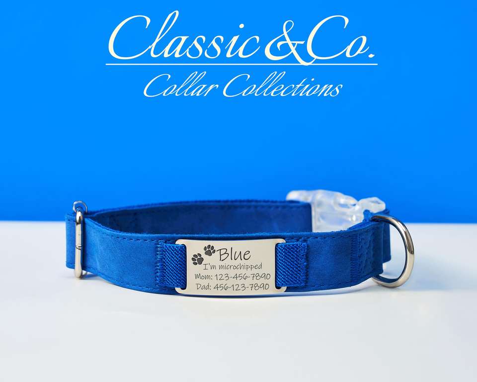 Suede Leather Dog Collar Personalized Leash, Adjustable Custom Blue Cat Collar, Engraved Metal Name Tag With Free Bell, Unique