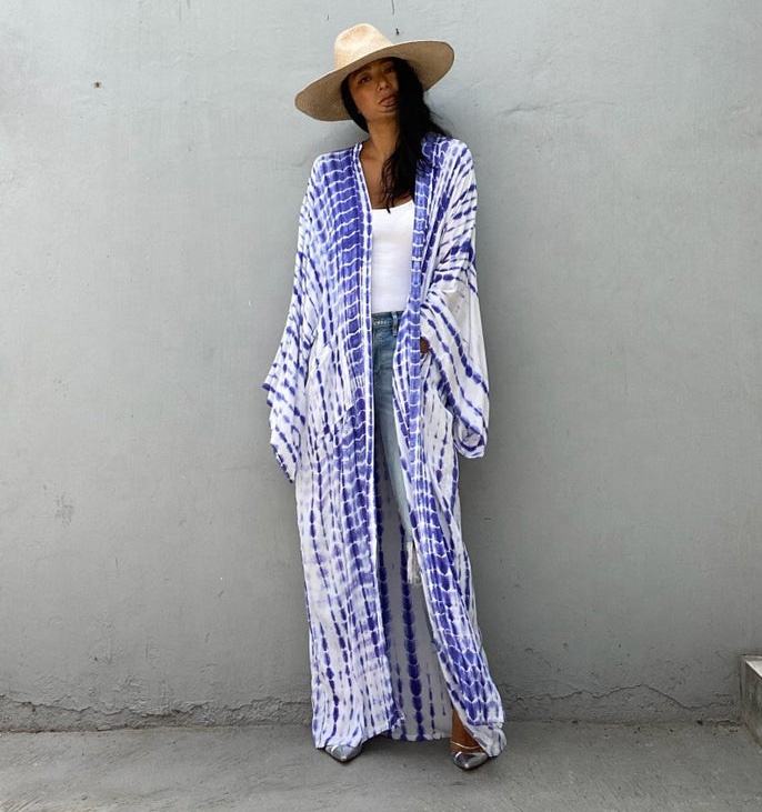 Summer 2021 Beach Fun Women Wear Rayon Tie Dye Pocket Robe Cover up Kimono Dress