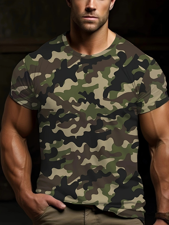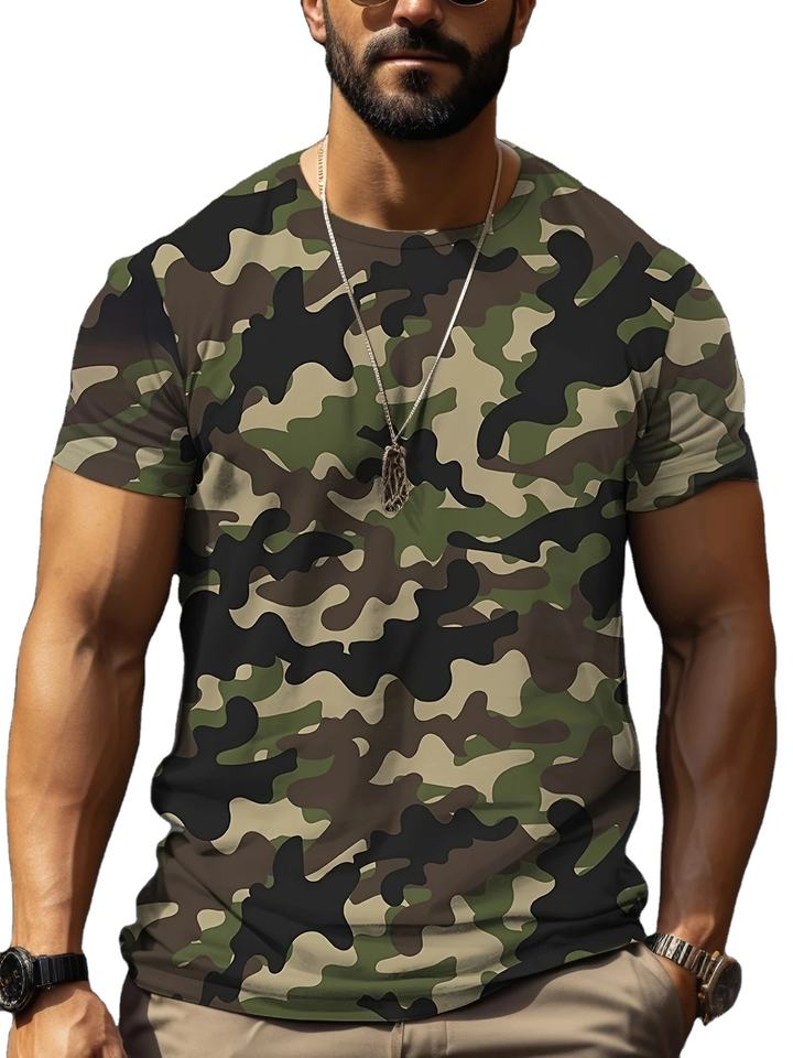 Summer 2025 Breathable Camo T-Shirt Comfortable Fit Short Sleeve Crew Neck 3D Digital Print Black/Grey/Brown Fabric Casual Style