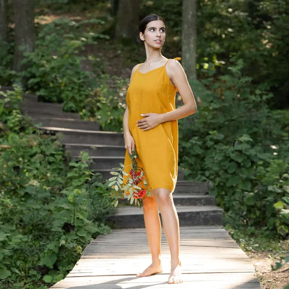 Summer American Fashion Women's Summer Solid Cotton Linen and O-Neck A-line Short Sleeve Loose Yellow Casual Ladies Dress