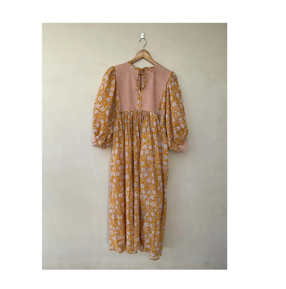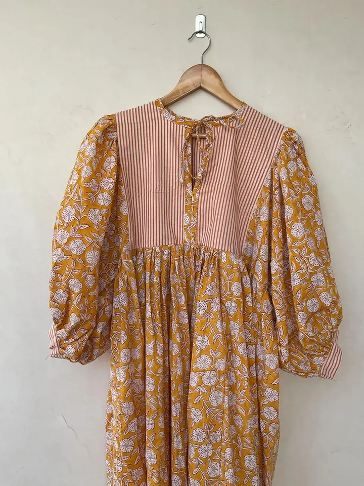 Summer Bohemian Midi Mini Dress for Women and Girls Cotton Block Print Deep Neck and String Closure for Weddings and Parties