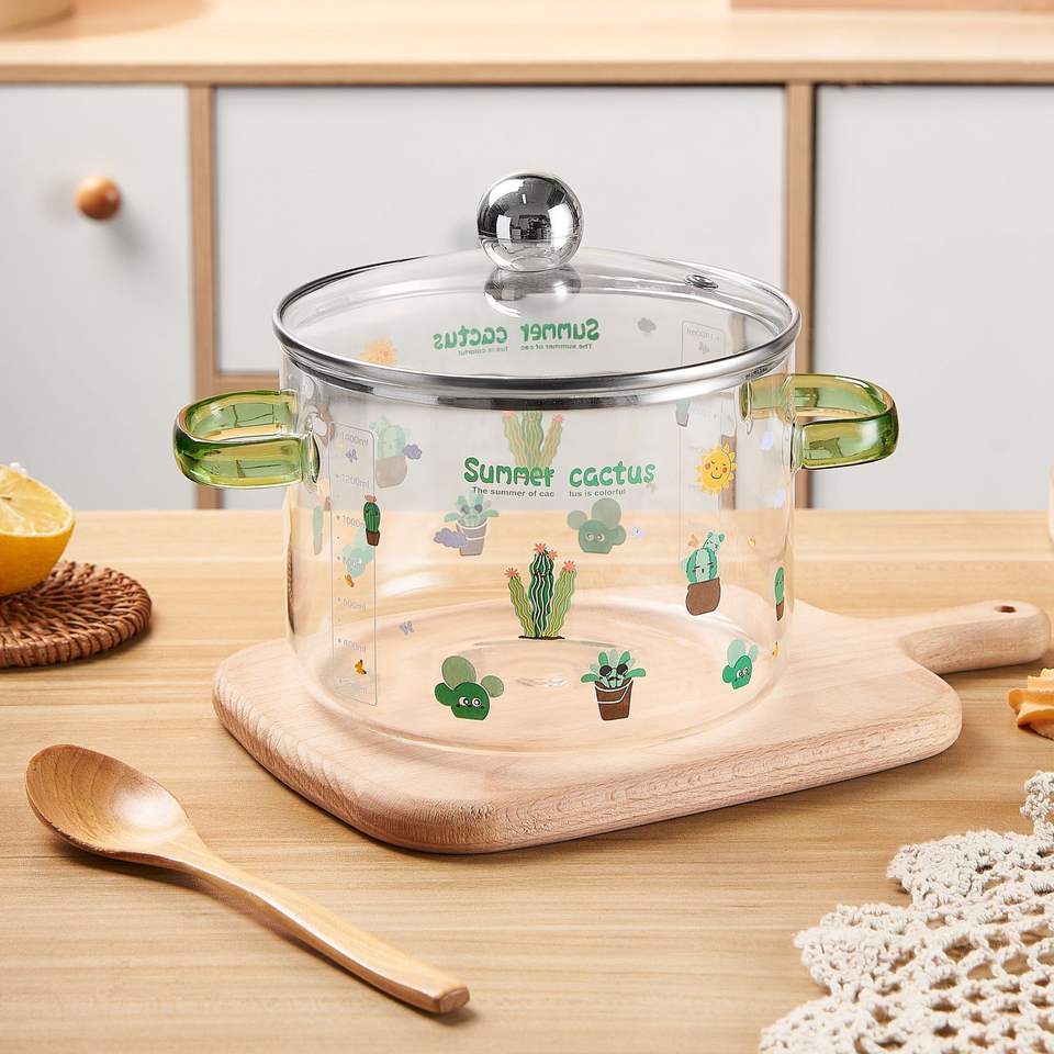 Summer Cactus Glass Soup Pot 1.4L With Lid Heat Resistant For Stove Cooking