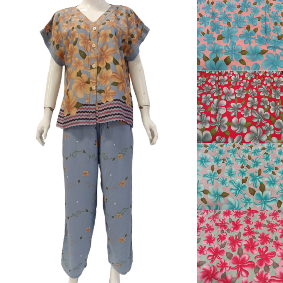 Summer Autumn Spring Casual Elegant Women's Rayon Floral Breathable Pajama Set Elastic Waist Full-Length Trouser Short Sleeve