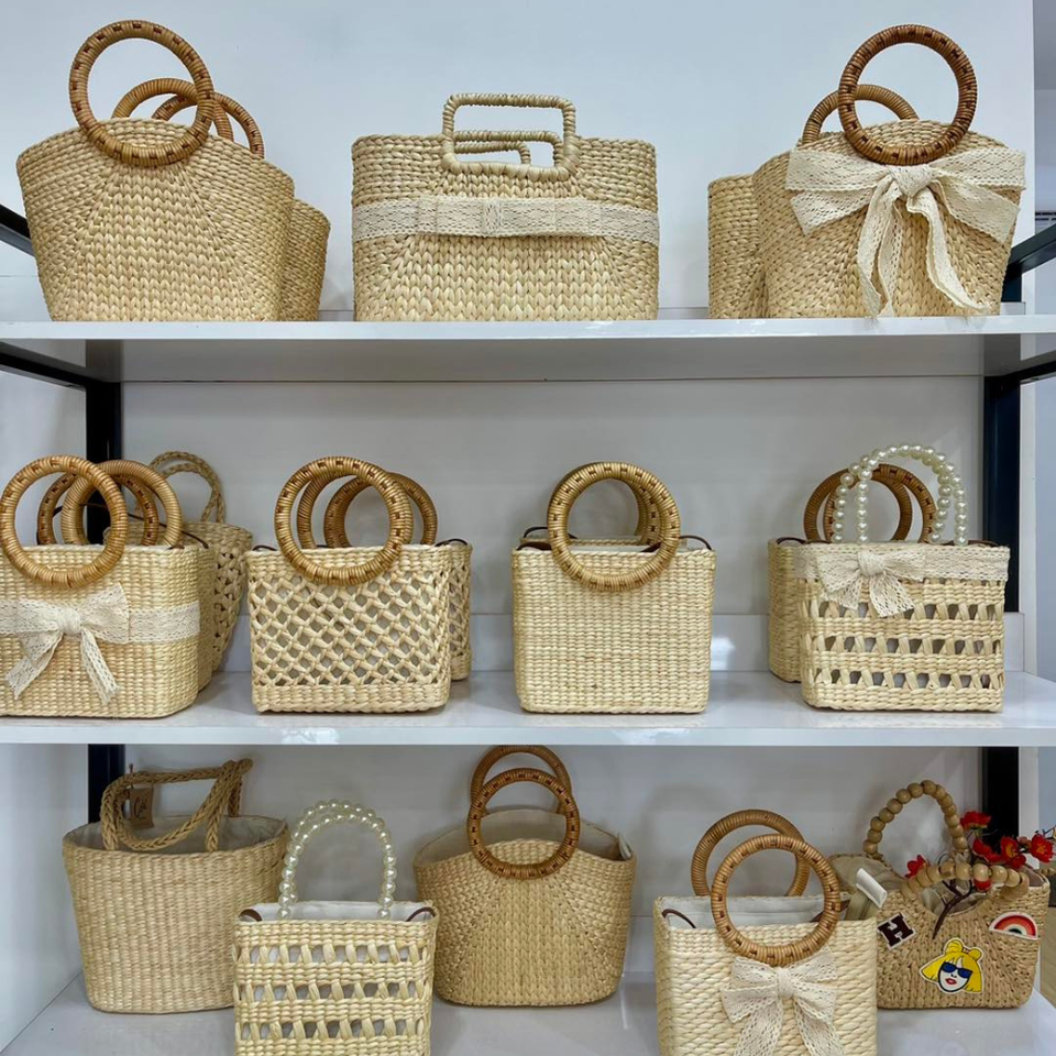 Summer Casual Women's Handmade Wicker Hand Basket Bag Rattan Handle Viet Nam Import Natural Water Hyacinth Outdoor Wicker Crafts